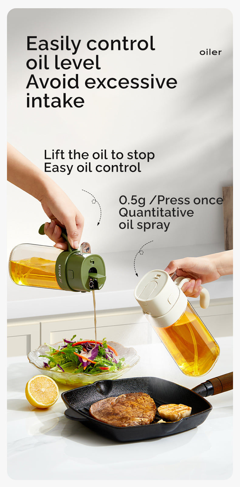 Innovative dual function design: Equipped with a stainless steel spout and a convenient oil return system to reduce mess, this bottle also features a simple push-button opening for effortless use. The fine mist spray port ensures even distribution, while the durable soda-lime glass keeps contents safe and fresh.